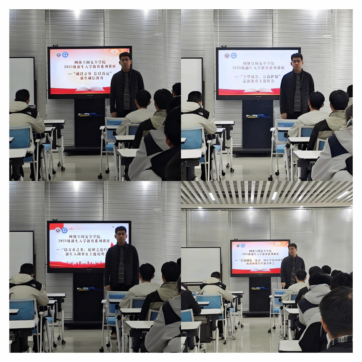 郭政良针对新生开展了四场教育活动:以“民族团结一家亲”宣讲民族政策;以“以青春之名,赴团之邀约”详解入团流程;以“守望成长,法治护航”普及法律知识;以“诚以立身”强调学术与交往诚信,全方位引导学生扣好成长“第一粒扣子”。