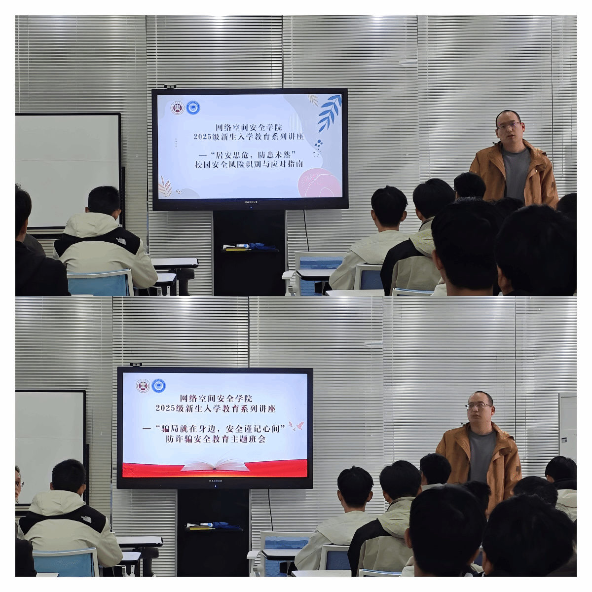 刘济宗为新生开展安全主题教育,先以“骗局就在身边,安全谨记心间”为主题拆解反诈骗陷阱,后以“居安思危,防患未然”为主题剖析校园用电、出行等风险及防范要点,提升了新生自我防范与风险识别能力。